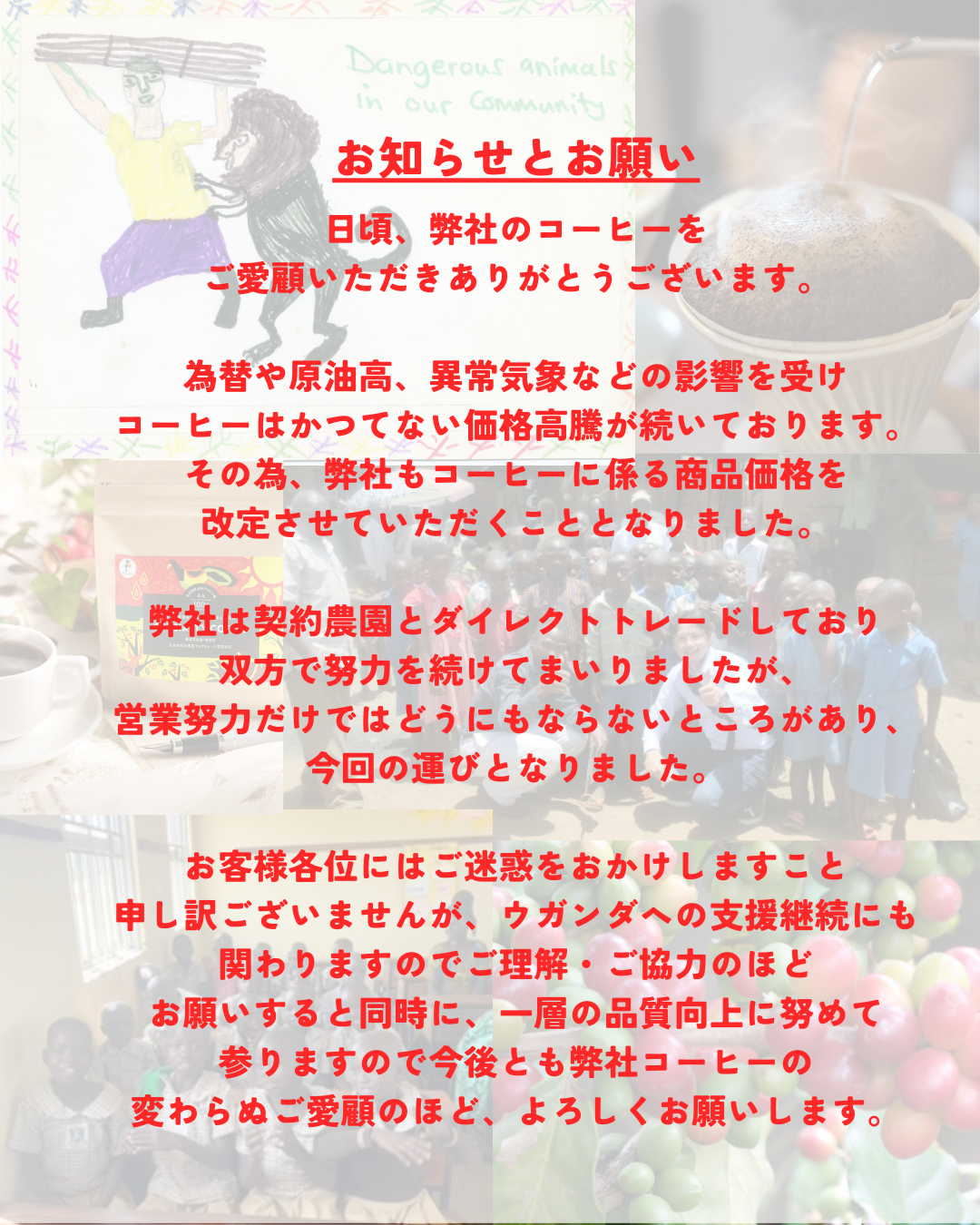 お客様にはご迷惑をおかけし大変申し訳ございませんが、コーヒーの品質維持・向上、ウガンダへの支援継続のため、ご理解・ご協力いただけますと幸いです。